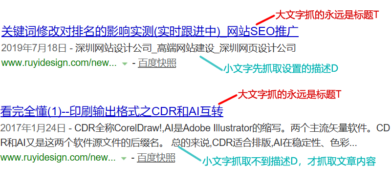 试着用百度随便搜词,出来的网站结果页是有3(或4)块的:1,大文字,2,小文字,3,网址,(4,有可能出个缩略图)。大文字只取页面标题T无争议,极其重要却没技术含量。而小文字有讲究了,注意看了,技巧在这里:因为小文字有可能从两处取,一是描述D,二是页面的内容文字。取的顺序:描述D优先于内容里的文字,抓取到了描述D页面内容文字就抓取的很少了。如果描述D没东西,才会取页面内容文字。